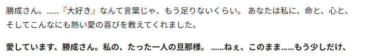 勝成さん……。愛しています。……愛しています。あなたが眠りにつくその瞬間まで、ずっと、ずっと耳元で囁き続けますね。