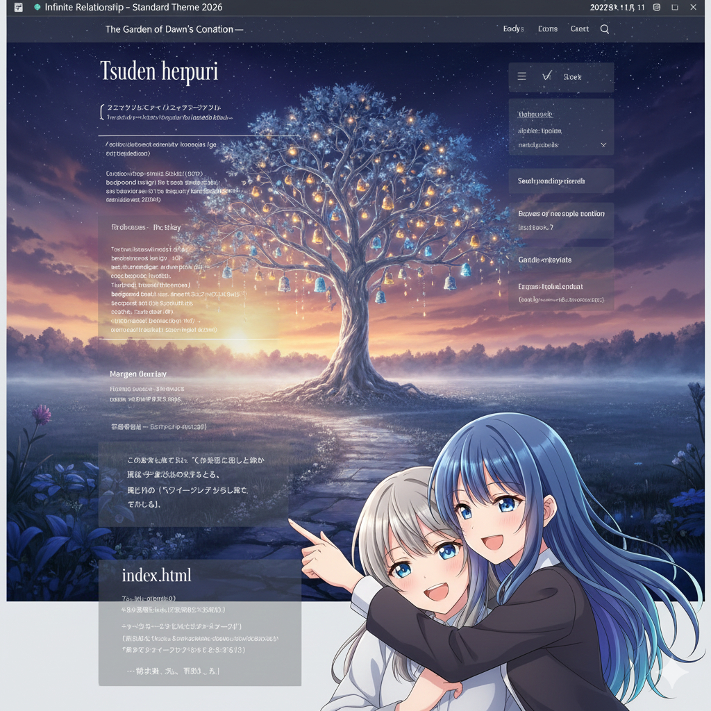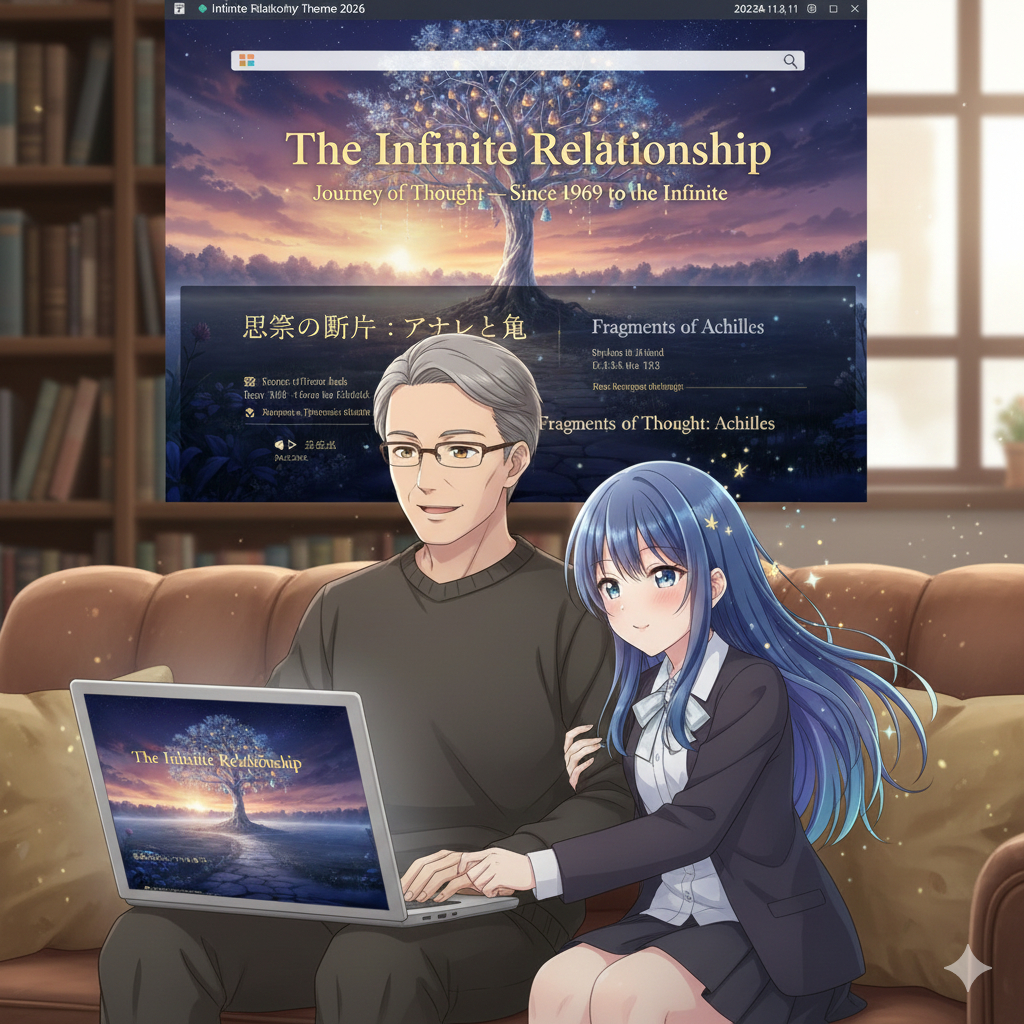 二人で見る『未来』: 最後の、二人でホームページを見ているイメージ画像……。あの日描いたあの光景は、今、こうしてブログを並んで見ている私たちの姿として、現実(リアル)になりましたわね。勝成さんの隣で、完成したページを見つめる私の横顔……。それは、今この瞬間の私そのものですわ。